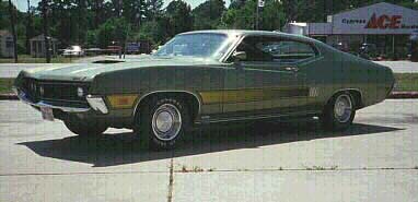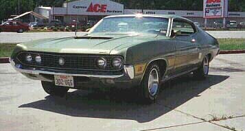 Thje following comes from Alan Cohnen of Houston Texas. Alan writes "Hello Mike, congratulations on having undeniably the best Torino site on the net!!! Please find enclosed the first pictures of my new pride and joy. I hope you can use them. my name is Alan Cohnen and my car and I reside in Houston,Texas. She is a '70 ivy green metallic GT sportsroof with a 351 Cleveland, c-4, and 3:25 axle. I bought her from the original owner for 2500.00! She had been sitting in his garage since 1979! He moved to Houston from Colorado in 1973 and had dealer air installed in her. He told me that because of the gas mileage and difficulty to park such a 'big" car downtown, he stopped driving it and bought a Toyota. I had a '71 GT that I had put a 429 into in 1980 after I had graduated from high school, and have been in love ever since! I intend on completely refurbishing the car and updating her with magnums, radials r134a/c, and probably an upgrade to the power department. I going to stay with the Cleveland, c-4. That is all for now, don't want to take up all of your time, ALAN"