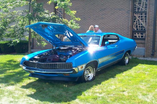 The following comes from a friend of mine, Bob Rowan of Warren, MI. Bob says "This is my grabber blue 71 Torino GT. It has a 351C,4V,C-6 Trans,3.91 Locker. I bought this car in 75 from a nearby Ford Dealer. It had a multitude of dings, no radio and a torn off power steering cylinder. All of these things were easily overlooked because of the awesome color, laser-stripes,shaker and hideaways. In 92' I reworked the body, did the paint, freshened the engine and had a new trans installed. I also installed the locker at this time. This past year,I added bucket seats, new carpet, more engine detailing & an in-dash tach. would like to thank Mike for posting my car on this web site. Thank You!"