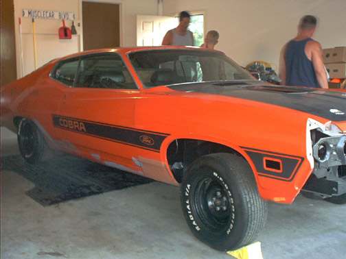 The following comes from Dave. Dave writes "Hello Mike I happened upon your web site and thought I would write in about my '70 Torino 429 SCJ which is currently in the restoration process. Not sure if you are familiar with the Twister Special. I think there are only 7 like of 30 known to exist. It is an "R" code factory Drag Pack with all the goodies. Currently, there are only 7 none like left. Nodular rear end 4:30 Detroit Locker, Hi - in Hi - out 4 speed top loader, etc. etc. Motor has just been completely gone through with all of the best ($8,000 worth). Whole suspension and undercar is new and powder coated. Engine compartment has been detailed and is waiting on engine installation. Still waiting on tranny rebuild which should be complete by Sept. Interior is just waiting on me to piece it back together. In the process of going through the wiring. Car has no rust and a good straight body. Real clean car. Good to talk with you. Dave"