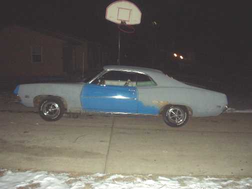 The following comes from Josh Andrews. Josh writes "Hi, I just thought i'd send a pic of my "Beast" It is a 1971 Torino 500 with a 302 2-barrel and a c-4 trans. I am 17 years old and paid 300 dollars for it a couple of months ago. I almost have the body work done now. I am getting it painted the original Grabber Blue. I'll send more pics when its painted."