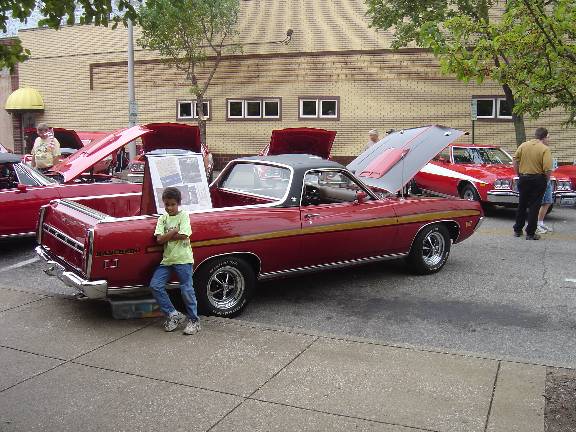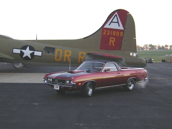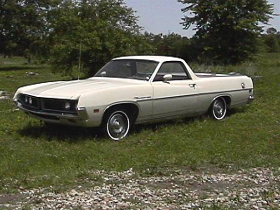"My Name is Mark Banta of Martinsville Ind. I have sent several Pic's of My 1971 Ranchero it was that ivory collar and totaling un molested, when I found it. The former owner a school teacher had parked it in her barn in 1980, and when I bout it from her heir in 1999 it had only 41,237 miles on her. and believe it or not after putting fresh gas oil and a bat airing up tires it started and ran! I began the restoration ASAP I had to change a few thing though, she came as a stock 500 with a 302 2v c4 and 8.8 3.00 rear end and drum Brakes front and rear. Now Sporting new Cobra style paint stripes and hood vinyl top Magnum 500 wheels she also has a fresh cam'd 351c 4v rebuilt c4 with shift kit and a 9" L 3.00, Disc brakes all around, dual 2.5 exhaust with stainless tips, all new Interior and most recently added the stock A/C system. These ranchero's are so rare in the midwest I have yet to see one at any car show I've been to. I have taken home some award from every event I've attended since she was completed in aug of 2003.