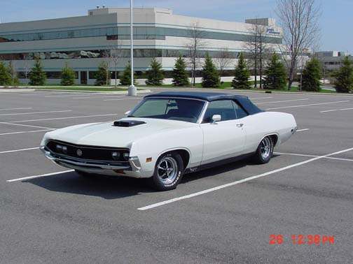 The following comes from Mark Stevens of Brighton, Michigan. Mark writes "Mike; Here goes... 1970 Torino GT Convertible w/68,000 miles from Carlisle, PA; 1983 GM pearl white w/blue top...redone two tone blue Cobra interior (seats, door panels & dash w/ribbon tach) 540 watts of boomin' Kenwood stereo with a big box o' woofers in the trunk. Magnum 500's w/spinners and BF Goodrich TA rubber all round. Rebuilt front end with big 429 Cobra power disc brakes & Wildwood propotioning valve. Grant GT steering wheel. Rare shaker ram air hood w/hide-a-way headlights.