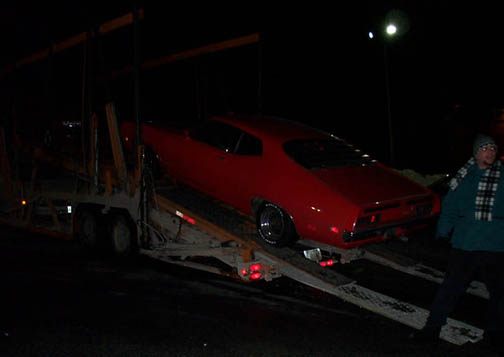Fellow Yahoo Torino Club member Michael Curry just bought this car off Ebay. So I got a couple pictures along with an email he sent me and posted them here...."She just got dropped off the transporter tonight...I am so psyched, a little nervous becase it was an auction... met the transporter at a mall near my house (2 block, a 85 truck would never make it into my neighborhood) She looked good up there...solid straight etc, i got up and roller her off, and walked the car she has a few places a little touch up would help (like a spot where it looks like battery acid driped in a spot on the top of fender) but all in all she is very very clean, the exhaust looks first class and she has headers. When started up i was plesantly suprised the cam sounded pretty aggressive sounded mean! I drove it around the lot a little but since i was rusty with stick and all the snow here had a friend drive it home to my driveway (safe and sound) the car needs a few things for sure.... car has 240 r 14's they need to go at least in the rear, what meat do you run on your rear Mike? I want to put the thickest 15"s possible w/o bending anyhting i run 275 r15's would like that size if they fit (she has air shocks and tracktion bars) the engine seems very very strong wich i am estatic about sound monsterous even the 4spd seems good, interior is pretty mint the few things with the car, the factory hood pins etc look like they are fudged, Mike I might need pics of the underside of yours if you can...