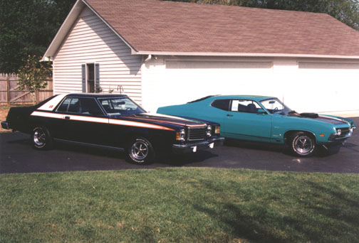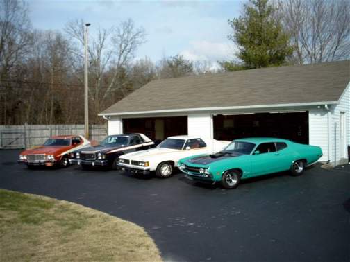 1-2-2005 - "Mike, It was almost 70 degrees here today in Tennessee so like Lynrd Skynrd said Live on "Gimme Three Steps".....I "brought all my mules" out today. From left, 1976 Limited Edition Starsky and Hutch Gran Torino, 1978 LTD II Sport, 1977 Pontiac Can Am...only 1377 built, and my Grabber Green 1970 Torino Cobra. All ya'll have a Happy New Year.