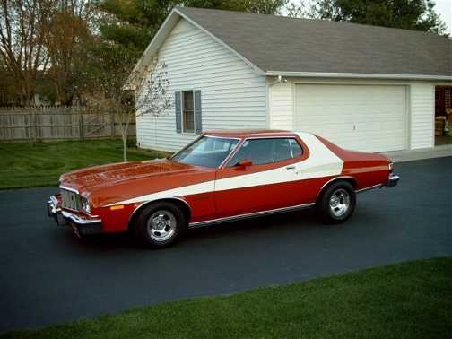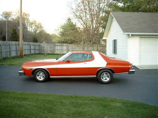 "Hi Mike, Here are some pictures of a new car I have added to the others you have pictured on page 5 of your members photo page. It is a real 1976 Gran Torino Starsky & Hutch model I bought in the fall of 2003. It has a 351 W, factory air, factory am-fm, console, and bucket seats. The car has had a full top to bottom restoration along with a couple of cosmetic modifications to the engine. It came with two build sheets and lots of documentation. It doesn't have the "fun factor" of driving like my Grabber Green 70 Cobra, but it is a great conversation piece at shows and cruise-ins, and I do drive it to all the events! Thanks and take care,