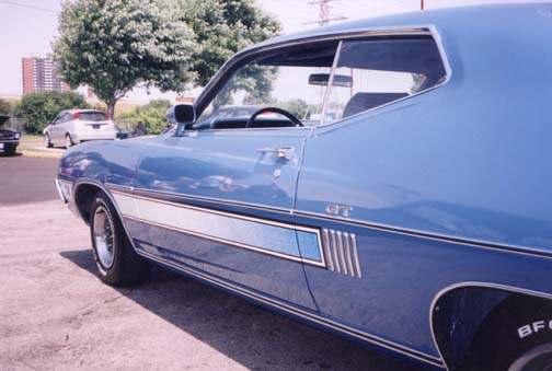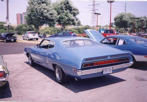 All I can tell you (owner unknown) is it is a GT car it has a 351 2 bbl engine it's not modified - all stock, blue interior and bench seat, single exhaust, painted medium metalic blue code Q and it has a horse shoe on the grill good luck I guess. Steve"