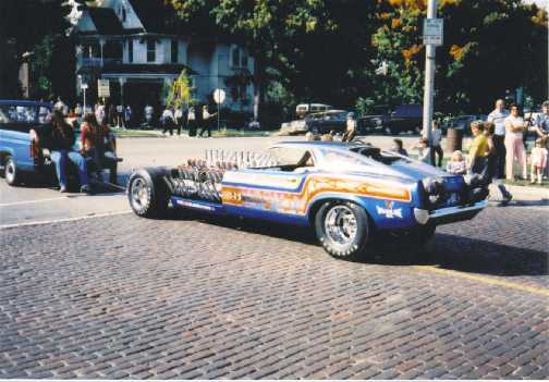"Mike, Here are some pics of a 69 MACH-1 drag car with 4 -351 windsor mills in it.These pics were taken in 1984 at the Delaven,WI Octoberfest parade.I thought you might want to post these in your drag racer picture file.My last musclecar was a 69MACH-1 so they are very special to me,but everyone has a mustang so I decided to buy a even cooler and rarer car,a TORINO!"