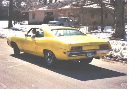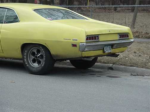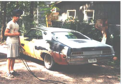 The following is an update from Tim Lien of Ames, Iowa. Tim writes "Here's a report to ad a little closure to the story of one of the most abused Torinos on the face of this earth (the saga, "as the torino turns"). Over the summer I spent my days working out kinks in my brake system, building up and tuning my motor (unfortunately no pics), and doing a whole lot of body work. I welded some scrap metal in place (all I had was a 220V 80 watt stick welder, darn!!) where the quarter panels used to be. Now there aren't any gaping holes on the car. I chose to paint the car in a cobra scheme, and yes it is still a 500 I know. The yellow is matched from a 2002 Mustang Cobra (the color is Zinc Oxide Yellow). The hood paint is actually matched from ford to be the same as a 1969 Mach One's hood. I also managed to piece together a new exhaust system, interior, and added a few aftermarket guages. My torino was rollin march of this year and painted in august. I started (feb of 2002) with a 250 dollar neglected automobile, and now I have a beauty that was recently appraised (september 2002) to be worth over $4000. I think the appraisal might have been a bit exaggerated though. I figure that's pretty good for a 17 year old working part time at a grocery store. Anyway, i just bought some keystone klassics that'll go on this spring. Plans are to paint my car black in the spring after a little more minor body work, and jack up the back end for some fatties. Thanks mike for the great website, and to all the supportive (sometimes sympathetic) torino lovers in the forum. ~Tim "torino" Lien
