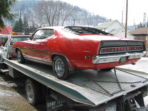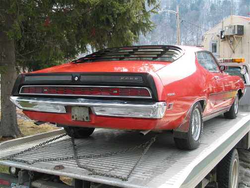 The following comes from Tommy Dowling of Long Island, New York. Tommy just picked up this car on March7, 2003 in NW Pennsylvania. Tommy writes "Hi Mike, photo's of the Torino I picked up Saturday. Not 10 minutes from where we picked it up we stopped for gas for our thirsty flat bed. A individual approached us, and whipped out his wallet. He showed us pics of his 1970 GT! Within a few minutes the car had a crowd of at least 10 people standing around it, checking it out. My thanks to the "stranger" whom owned that 70 GT. He showed me how to open the rear louvers so I could clean under them. I feel like a child on Christmas eve! I was looking for a car like this a few years ago when I found a 1964 Galaxie Fastback that was in pretty darn amazing shape. So I enjoyed that call till the curse of "divorce" stole it from me. Perhaps this Torino is a bit of payback? <wink> Hopefully I will become an active participant in the Forum. As a ASE Certified master Tech sometimes it's hard to find the "Urge" so to speak to get motivated. Thanks again for Providing the Torino Guys a Home. Tommy