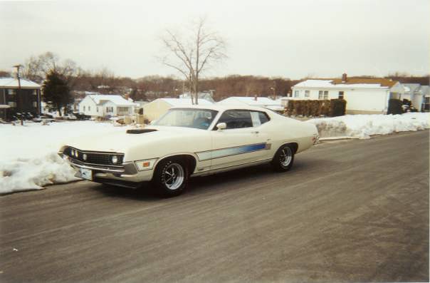 The following comes from Torino Steve in Rhode Island. Steve writes "Here it is Mike, The photo!!!!! It was taken today! 3-12-01 a blistering 25* out ! It fits the car as my son calls it"" Snowball""....he's 4 years old!. This 1970 Torino GT is white on blue with a 351C 4V engine/3 speed/ 9" rearend with 3.50 gears, Bucket seats and a console.. shaker hood ,rear window slats and last but not least...molded carpet!. well i hope you like it.. I do! PS. No!! i don't drive it in the snow, just had it out to run the engine! guys...........Thanks Mike!! Torino Steve from Rhode Island."